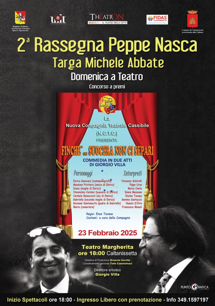 Settimo appuntamento, domenica 23 febbraio, con la rassegna teatrale intitolata a Peppe Nasca, Targa Michele Abbate, organizzata dalla compagnia Thèatron di Caltanissetta.