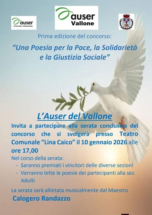 Per nobili motivi di diffusione della poesia “sconosciuta” e inedita ai più, quale interiore risorsa oppositiva alle derive tossiche del nostro tempo, l’ Auser del Vallone ha deciso di pubblicare on line le poesie vincitrici del concorso “Una poesia per la pace, la solidarietà e la giustizia sociale”, prima edizione, che si è realizzato recentemente con la premiazione dei poeti e delle poetesse, i vincenti e i menzionati d’onore, giorno 10 gennaio 2026, al Cine-teatro “Lina Caico” di Montedoro.