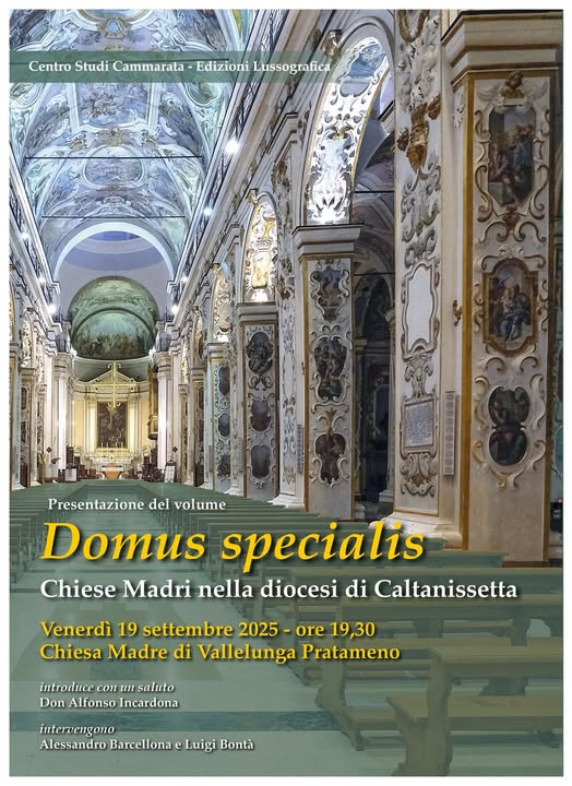 Venerdì 19 settembre, alle 19,30, nella chiesa madre di Vallelunga, sarà presentato “Domus specialis – Chiese Madri nella diocesi di Caltanissetta” edito da Lussografica per il Centro Studi “Cammarata”, che raccoglie 17 saggi di studiosi e storici locali su tutte le chiese madri della diocesi, coordinati dal prof. Luigi Bontà.