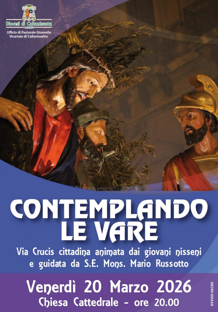 E’ il momento più intensamente spirituale che si celebra intorno ai sedici gruppi sacri che rappresentano le stazioni della Via Crucis: “Contemplando le Vare”, venerdì 20 marzo, dalle ore 20, si snoderà dalla piazza Garibaldi attraverso l’anello delle strade principali del centro storico di Caltanissetta con la Via Crucis guidata dal Vescovo Mons. Mario Russotto, che sin dall’inizio della sua missione episcopale ha voluto, per valorizzare l’impatto spirituale che le splendide sculture dei Biangardi sanno suscitare.