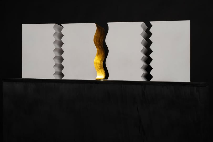 L’opera scultorea in legno, bianco e oro, simboleggia, attraverso lo sviluppo di forma primitive, lineari e minimaliste, il mito platonico dell’essere androgino e della ricerca della propria controparte, indicando nell’umiltà il valore di ogni relazione. L’idea dell’opera germina , infatti, da un aforisma moderno popolare: “Non esiste la persona perfetta ma chi combacia con le nostre imperfezioni”.