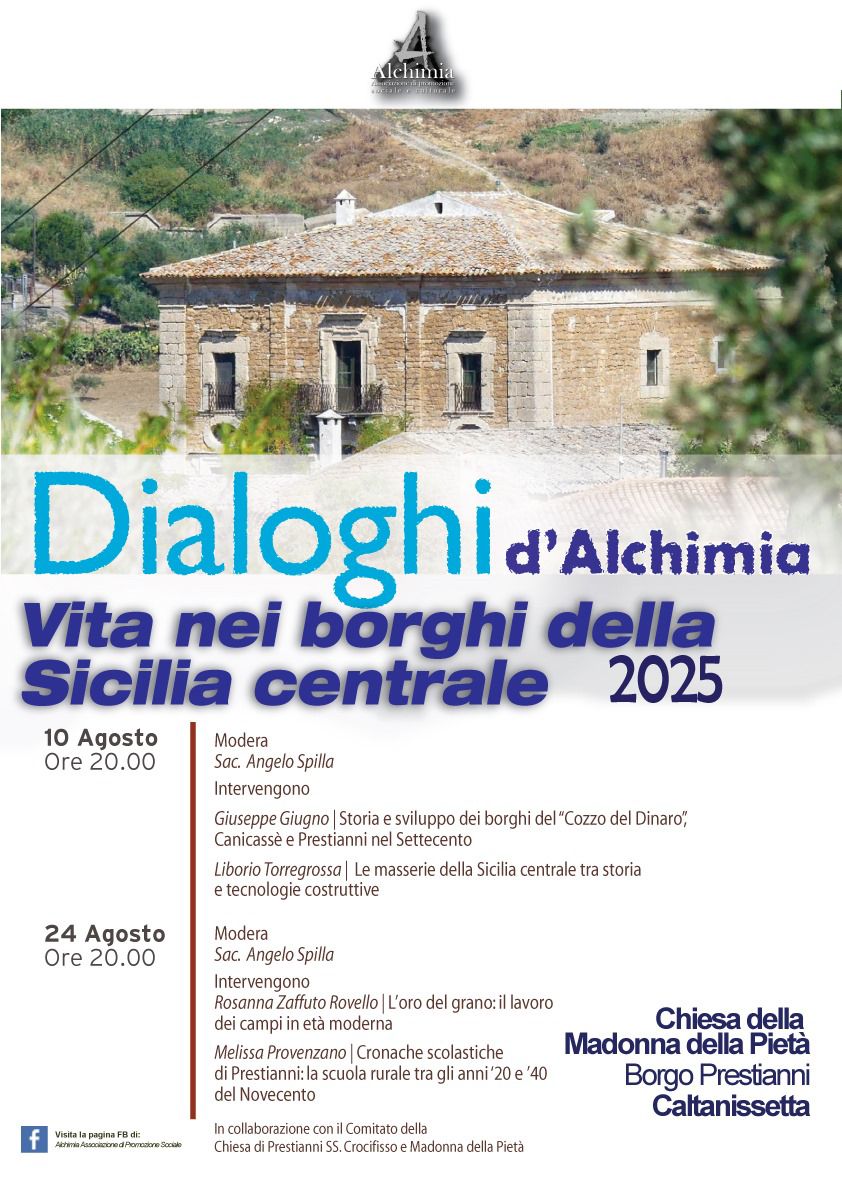 Domenica 24 agosto, alle 20, presso la chiesa della Madonna della Pietà a Borgo Prestianni di Caltanissetta, ultimo incontro del ciclo “Vita nei borghi della Sicilia centrale“, promosso dall’associazione culturale Alchimia, guidata dall’arch. Giuseppe Giugno.