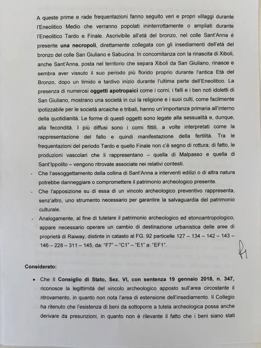 Si deve procedere ora da parte dell’Amministrazione comunale a chiedere alla Soprintendenza ai Beni Culturali di innalzare il vincolo paesaggistico ad un livello più alto di tutela (Tutela 3) e di apporre un vincolo archeologico preventivo. L’Ufficio Tecnico del Comune dovrà contestualmente predisporre la variante urbanistica di tutta l’area interessata per istituire il parco archeologico-scientifico-tecnologico della collina di Sant’Anna.
