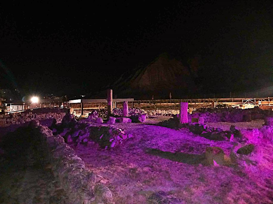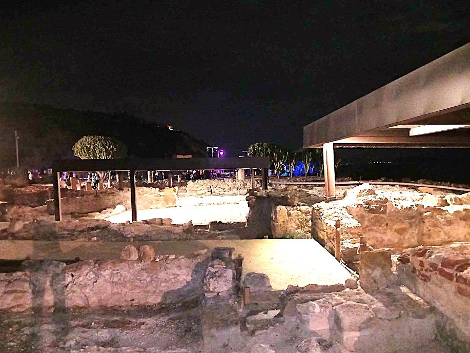 L’allestimento è molto easy o free (a gusto degli astanti). Il luogo si mostra affascinante. Manca un quarto d’ora al recital. Facciamo un giro sul camminamento appositamente creato per ammirare la villa di Durrueli (Publius Annius). Il sito è stupendo con una aria di mistero. Notiamo la vegetazione (troppo) spontanea. Per fortuna le nostre espadrilles ci difendono dalle spine delle piante di cappero selvatico. Il mare, il profumo, la luna…. Per fortuna siamo bene accompagnati dalla presenza femminile (per noi ancora gradevole) con cui abbiamo stipulato un accordo da circa quarant’anni.